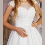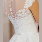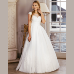 Vestido de Noiva corte A, feito em tule e renda.