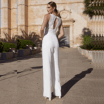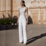 Macacão de Noiva, decote redondo, feito em renda e sablé.