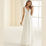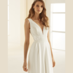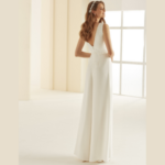 Macacão de Noiva, decote e costas em V, feito em renda e sablé.