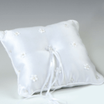 Porta  aliança de 20x20cm, tem um desenho muito alegre feito de cetim com flores bordadas cujo centro é uma pequena pérola. Duas fitas de cetim pendem do centro da almofada para amarrar as alianças. Além de ser uma bela forma de apresentar os anéis, garantimos que eles não caiam do bolso.