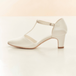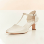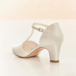 Sapato de noiva feito em cetim, tacão de 6 cm, forro interior de espuma suave para maior conforto.
