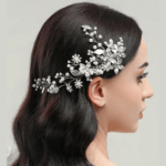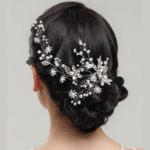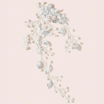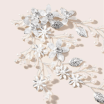 Maravilhoso toucado feito a mão, com pérolas, folhas e flores prateadas.