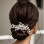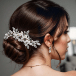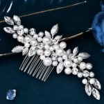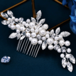 Toucado feito a mão com pérolas, strass e folhas prateadas.