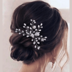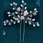 Toucado em formato de U, feito a mão com pérolas, miçangas, strass e folhas prateadas.