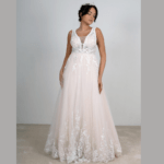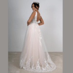 Vestido de noiva corte A, decote em V, feito em tule e renda com pedraría.