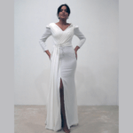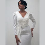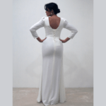 Vestido de noiva corte sereia, decote em V, drapeado no peito, manga comprida em balão e racha na saia, feito em chiffon e renda.