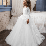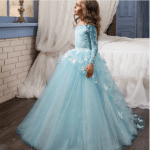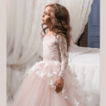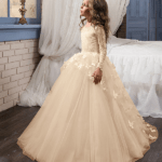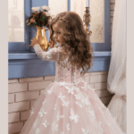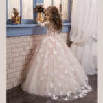 Vestido de Cerimônia manga comprida decote redondo, saia com varias camadas de tule, com borboletas na saia e cauda. Ideal para primeira comunhão, batizado, menina das alianças e cerimonias.