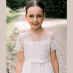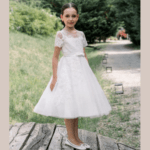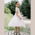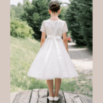 Vestido de Cerimônia curto, decote redondo, feito em tule, renda e pedraria. Ideal para primeira comunhão, batizado, menina das alianças e cerimonias.