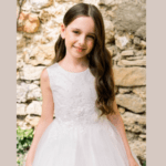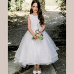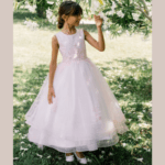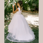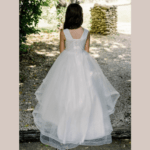 Vestido de Cerimônia longo com cauda, decote redondo, feito em tule com glitter, renda e pedraria. Ideal para menina das alianças e cerimonias.