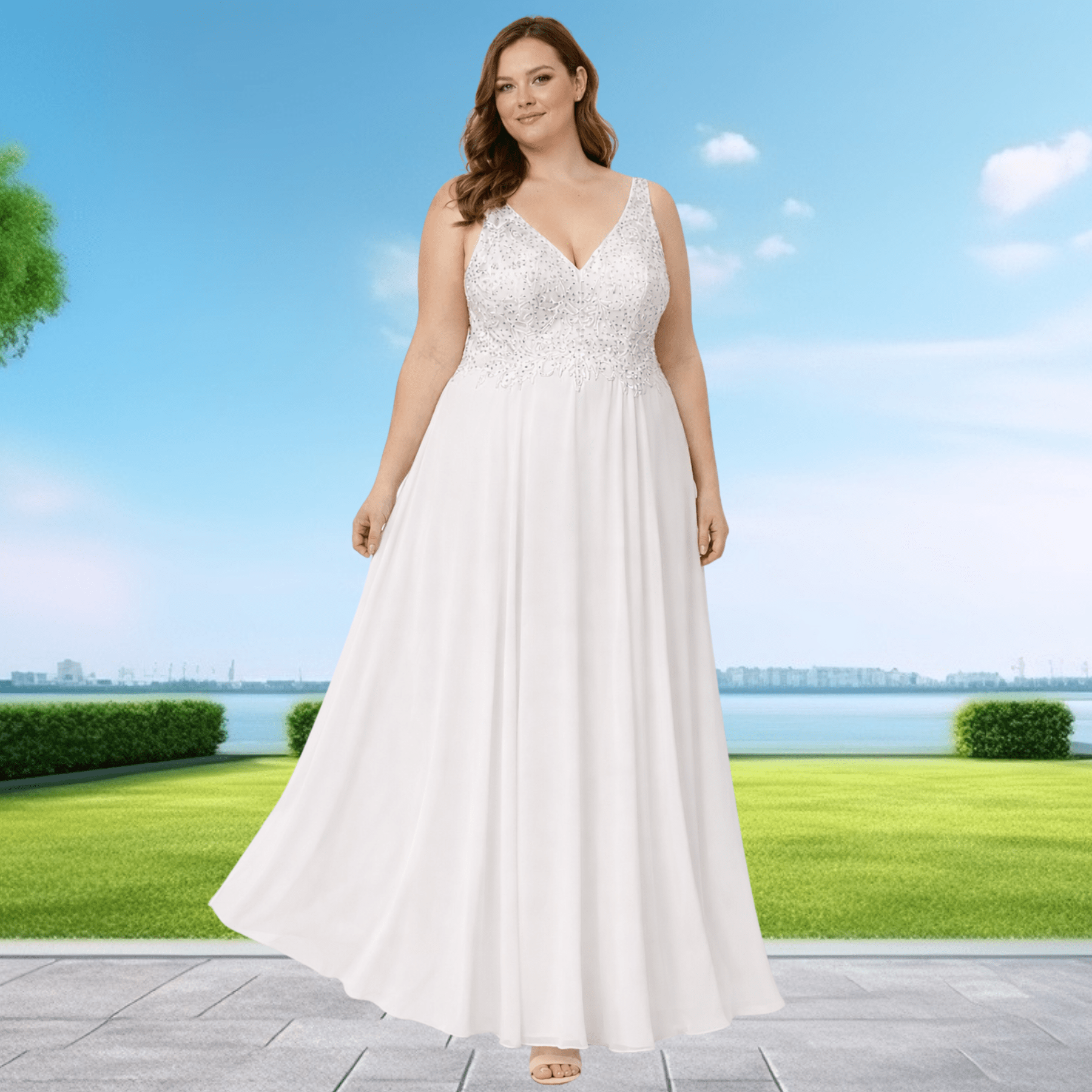 Vestido de Noiva corte A, com alcinhas, feito em chiffon e renda.