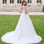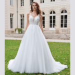 Maravilhoso vestido de noiva corte princesa, decote em V, feito em tule brilhante e renda, decorado com pedraría.