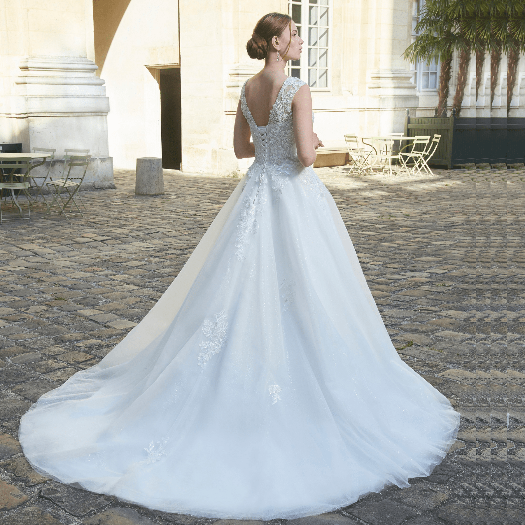 Maravilhoso vestido de noiva corte princesa, decote em V, feito em tule brilhante e pedraria.