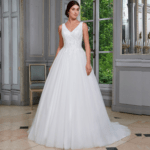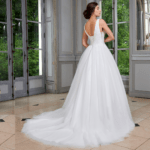 Maravilhoso vestido de noiva corte princesa, decote em V com alças, feito em tule e renda, decorado com pedraría.