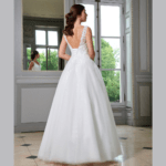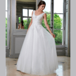 Maravilhoso vestido de noiva corte princesa, decote em V, feito em tule e renda, decorado com pedraría.