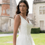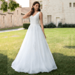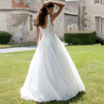 Maravilhoso vestido de noiva corte princesa, decote em V, feito em tule brilhante e renda, decorado com pedraría.