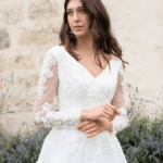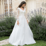 Maravilhoso vestido de noiva corte princesa, decote em V com mangas compridas, feito em tule brilhante e renda, decorado com pedraría.
