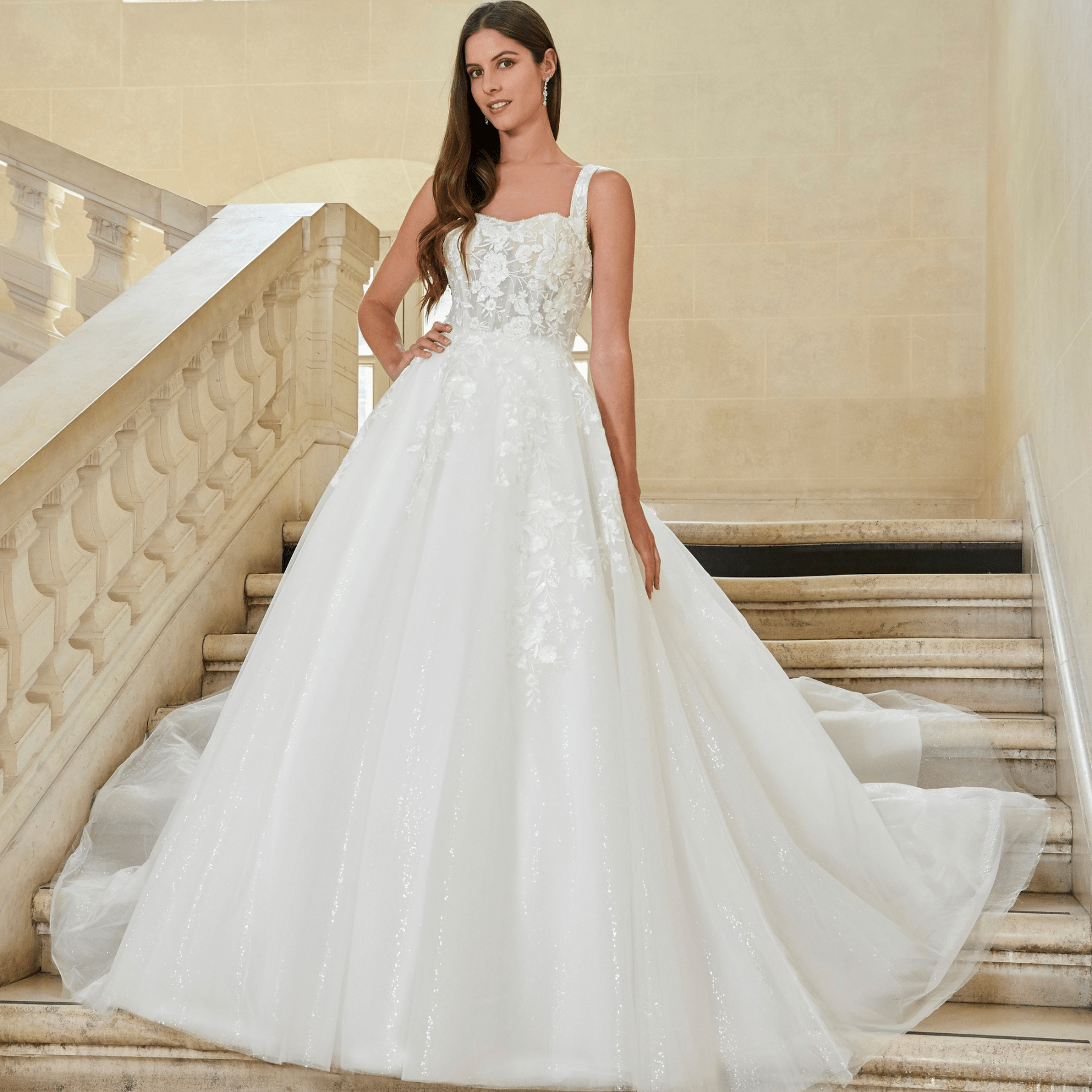 Maravilhoso vestido de noiva corte princesa, decote quadrado, feito em tule brilhante e renda, decorado com pedraria.
