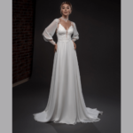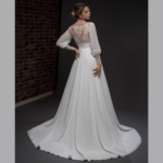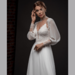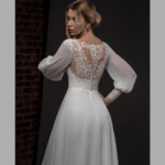 Vestido de Noiva corte A, mangas compridas, feito em chiffon e renda.