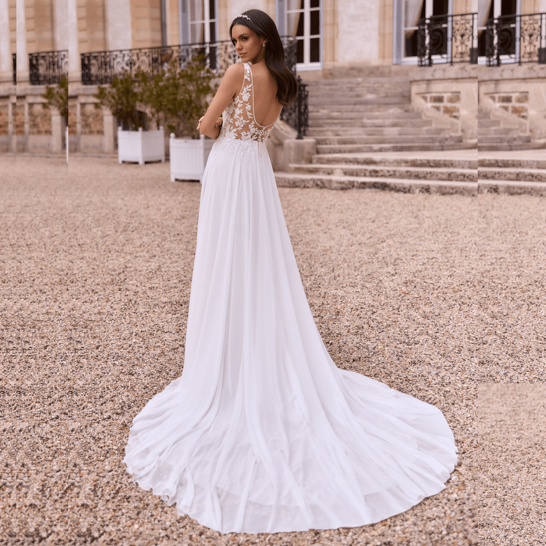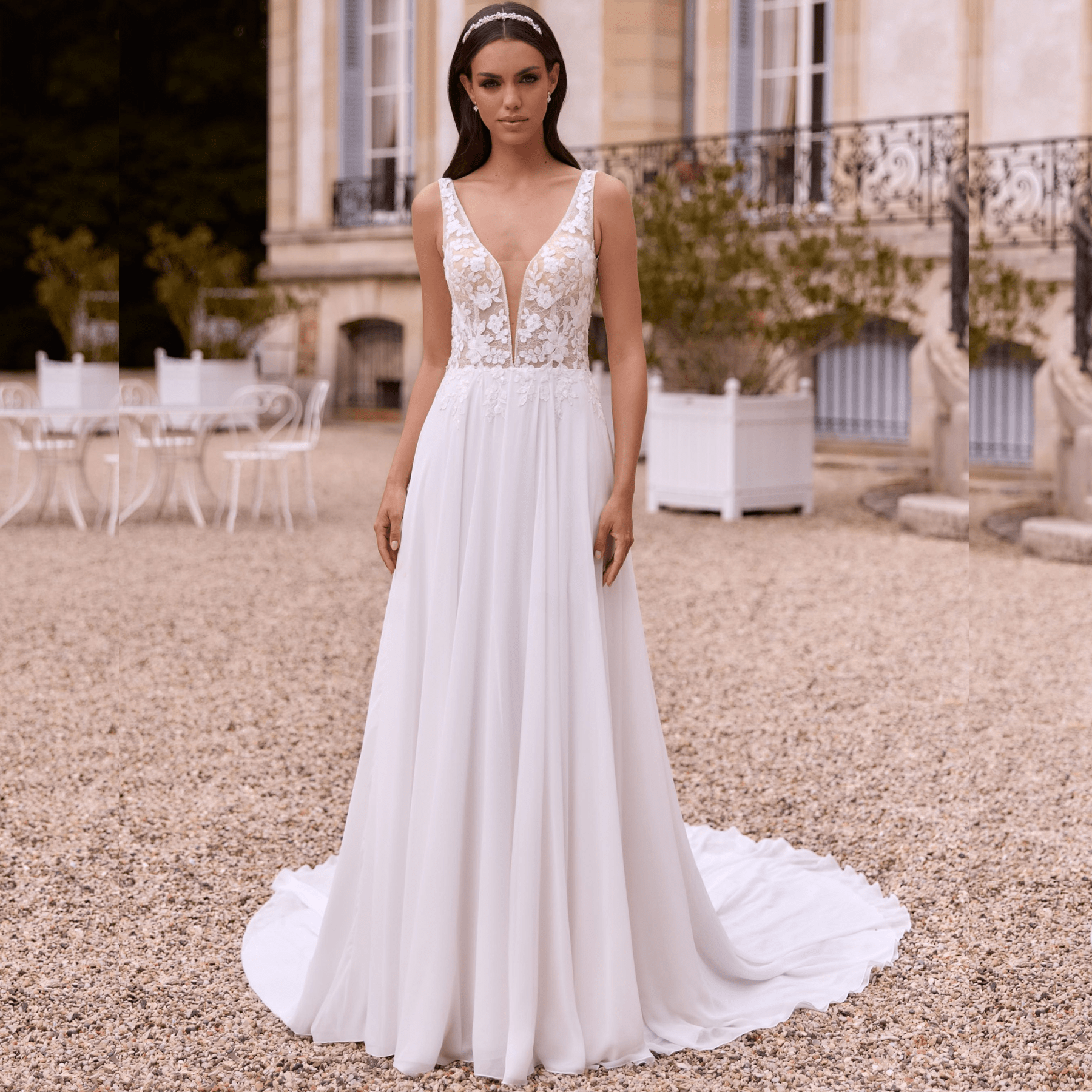 Vestido de Noiva corte A, com alcinhas, feito em chiffon e renda.