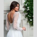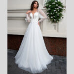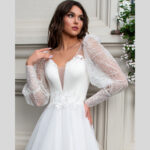 Vestido de Noiva corte A, decote em V ilusão, manga comprida, feito em cetim, renda e tule.