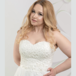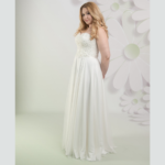 Vestido de Noiva corte reto, decote cai-cai, feito em chiffon e renda