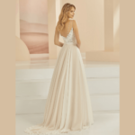 Vestido de Noiva corte A, decote e costas em V, com alças, feito em chiffon e renda com alta qualidade.