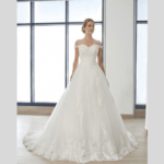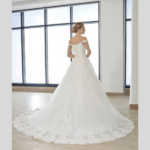 Vestido de Noiva corte princesa, decote ombro – ombro feito em tule e renda.