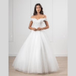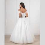 Vestido de Noiva corte princesa, decote coração ombro – ombro com mangas, feito em tule e renda com espartilho.