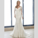 Vestido de Noiva corte Sereia, feito em Tule e Renda, decote em V com mangas compridas.