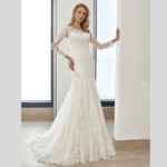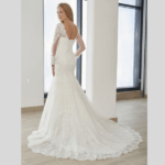 Vestido de Noiva corte Sereia, feito em Tule e Renda, decote redondo com mangas compridas.