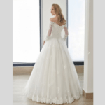 Vestido de Noiva corte princesa, decote coração ombro – ombro com manga comprida, sem cauda, feito em tule e renda.