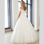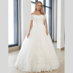 Vestido de Noiva corte princesa, decote coração ombro – ombro com mangas, feito em tule e renda.