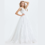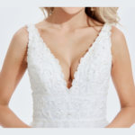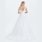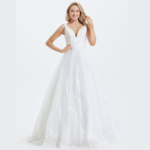 Vestido de noiva corte A, decote em V, feito em tule e renda.