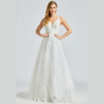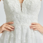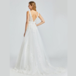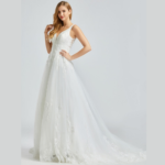 Vestido de noiva corte A, decote em V, feito em tule e renda.