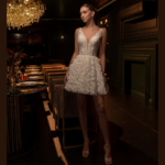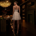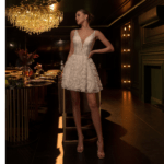 Vestido de Noiva corte A curto, decote em V, feito em tule e renda com alta qualidade.