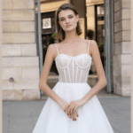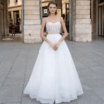 Vestido de noiva corte A, decote cai cai em coração, com alcinhas, feito em tule brilhante.
