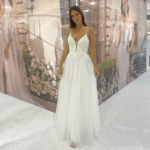 Vestido de noiva corte A, decote em V, com alcinhas, feito em tule brilhante e renda.
