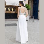Vestido de noiva corte A, decote em V, feito em tule, chiffon e renda com pedraría.