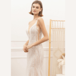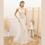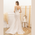 Vestido de noiva corte Sereia com decote em V, feito em tule com brilahntes.