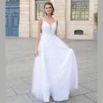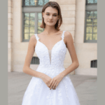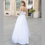 Vestido de noiva corte A, decote em V, com alcinhas, feito em tule brilhante e renda.