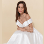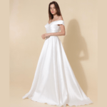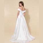 Vestido de noiva corte A, decote de ombro a ombro, feito em cetim.