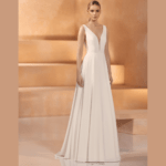 Vestido de Noiva corte A, decote em V, feito em georgette.