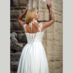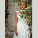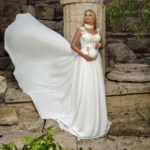 Vestido de Noiva corte A, decote coração, costas com espartilho, feito em sablé, renda e tule.