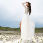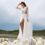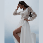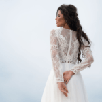Vestido de Noiva corte A, manga comprida, feito em chiffon e renda.