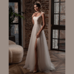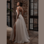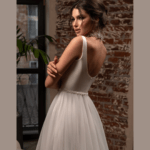 Vestido de Noiva corte A, feito em cetin e tule com pedraría na cintura.