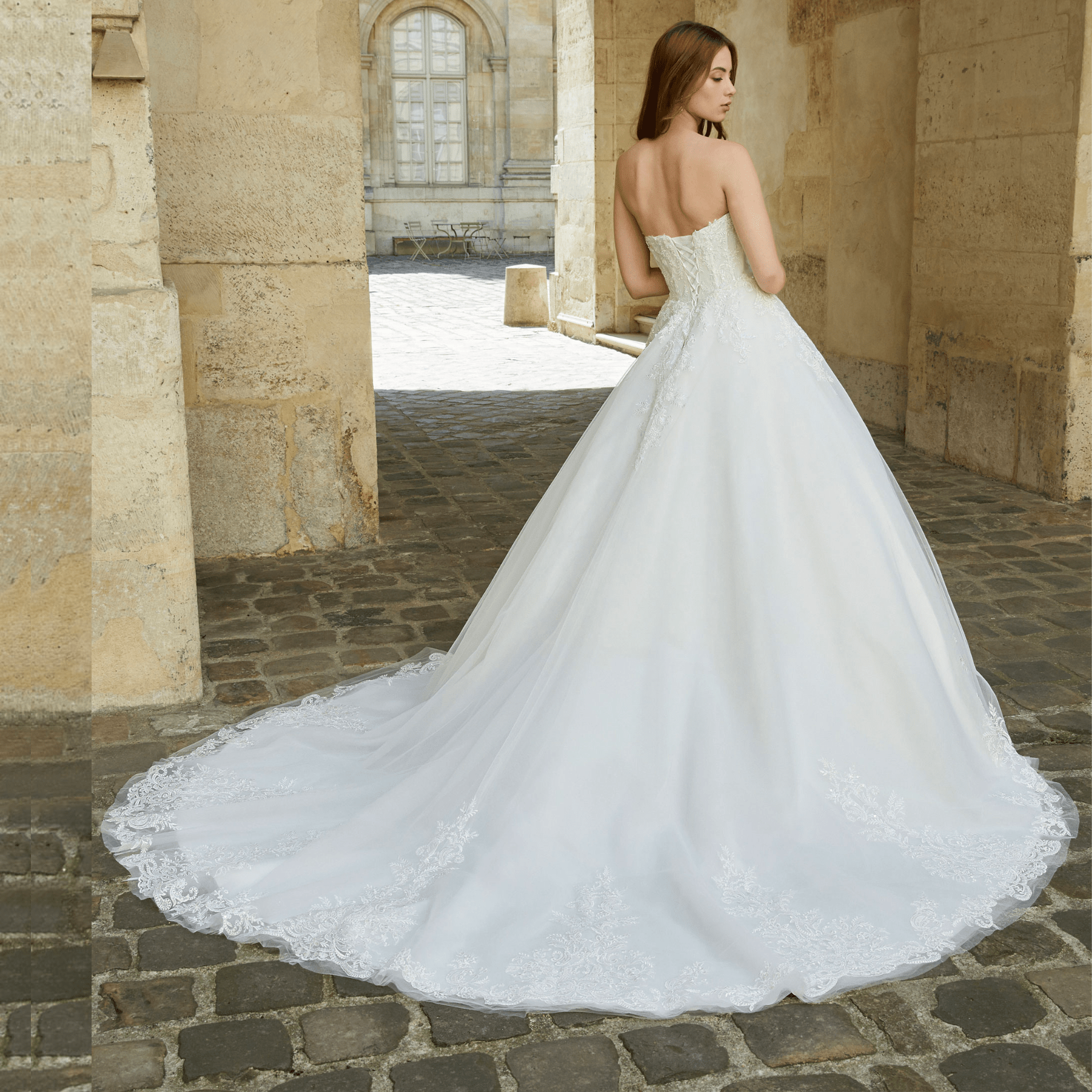 Maravilhoso vestido de noiva corte princesa, decote cai cai, feito em tule e renda, decorado com pedraria.