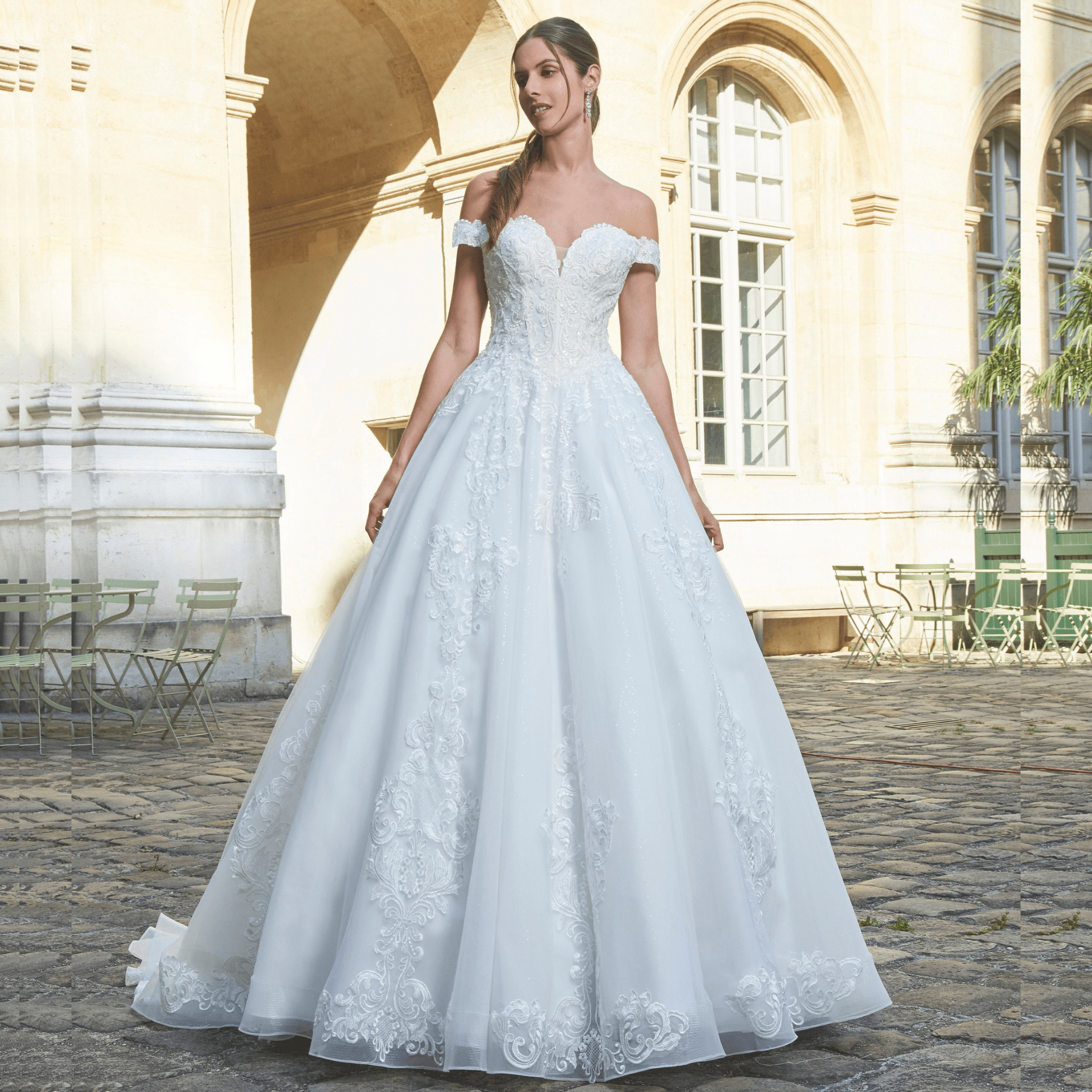 Maravilhoso vestido de noiva corte princesa, decote de ombro a ombro, feito em tule brilhante e renda, decorado com pedraria.
