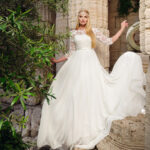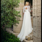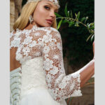 Vestido de Noiva corte A, decote redondo, mangas 3/4, feito em chiffon e renda, costas com espartilho.