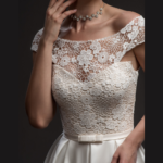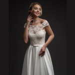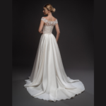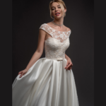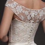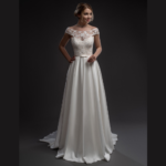 Vestido de Noiva, corte A, decote em barco, feito em cetim e renda.