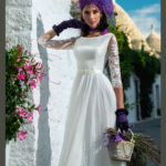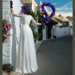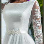 Vestido de Noiva, com mangas 3/4, feito em tule e renda.